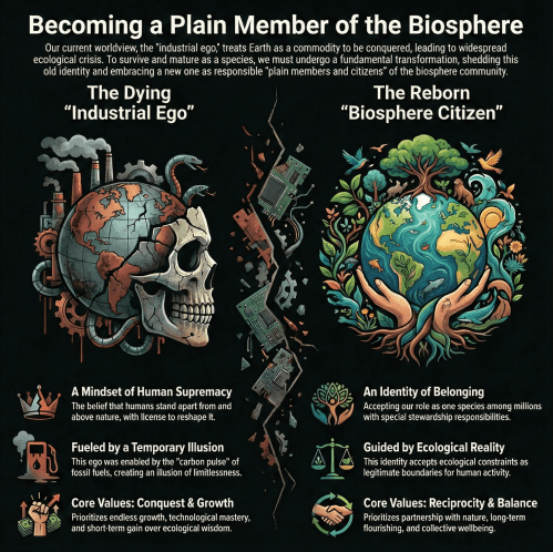 Becoming a plain member and citizen of the biosphere is not burden but homecoming. We have been in exile from the community of life, pretending separation and supremacy we never truly possessed. The return requires shedding illusions, acknowledging limits, and accepting our place.