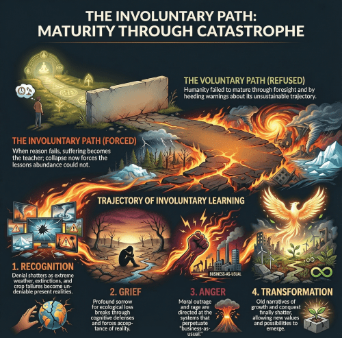 The tragedy is that it need not have been involuntary. Had industrial civilization matured voluntarily through foresight, much suffering could have been prevented. But the adolescent refused. The warnings were dismissed. The opportunities were squandered. Now the teachers arrive uninvited, bearing lessons no one wanted to learn.